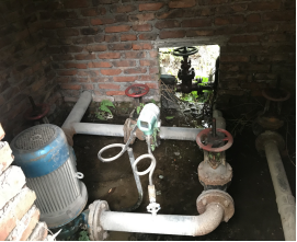 时间紧、任务重、难度大,恒源公司马上成立了项目工作小组,进行现场勘查、走访,了解用水情况,制定改造方案。由于该福利区地块标高已超出市区供水高程、地势偏远,位于供水管网末端,综合考虑以上因素,恒源公司技术人员选择采用占地较小并且经济节能的户外一体式二次叠压设备,利用市政管网压力进行叠压供水,并计划从205国道现状市政管上开口引一路DN150管至二次加压泵房,加压供水至用户。可是在最终施工方案现场确认时,又发现三农福利区西北方向挡土坡,由于受6月份特大暴雨的冲刷影响,小区边坡路面已发生沉降、开裂,将对二次加压泵房和管道带来极大的安全隐患,必须重新选择泵房位置和确定安全的管廊走向。经技术人员多次勘察、优化,最终将泵房确定在了更为安全、对居民影响更小的自行车棚位置,并重新调整供水改造方案。